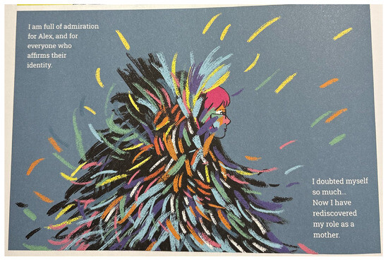In a short epilogic segment after Alex’s email, Anne narrates her own transition success. On a two-panel page representing Anne as the bird, she writes, “Today, I don’t mess up anymore. Saying ’Alex’ and ’he’ has become second nature.” The Anne/bird in the top panel is mostly black, echoing and transforming the “scribble” person of the early pages of the narrative. The scribbled lines coalesce into representation, suggesting feathers, and Anne’s human face peeks out from them. In the second panel (Figure 3), the feathers are multicolored and rainbow-like, and Anne’s face and pink hair appear to emerge from their energy. Her narration continues, “I am full of admiration for Alex, and for everyone who affirms their identity. I doubted myself so much ... Now I have rediscovered my role as a mother” (p. 170, ellipses in original).
