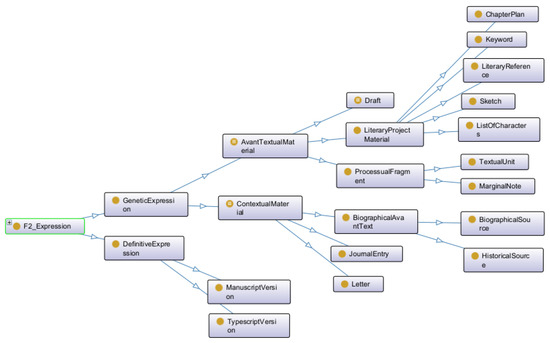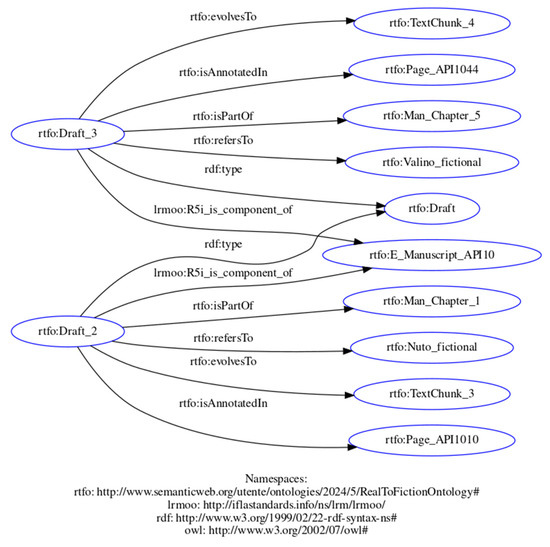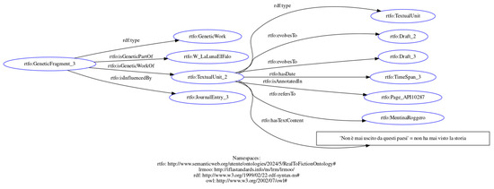 Projects like GENO (Genetic Networks Ontology)17 represent a significant step in modeling genetic relationships in an ontological model. Following French genetic criticism, GENO moves beyond the traditional avant-text model, mapping, instead, connections between texts, like diary entries, drafts and publications, to create a dynamic genetic network (Christen and Spadini 2019). The ontology distinguishes avant-texts linked via temporal properties and reuse relationships to track post-publication epigenesis. In addition, GENO attempts to align with FRBRoo’s bibliographic hierarchy (Work/Expression/Manifestation/Item), critiquing FRBRoo’s limitations in capturing provisional draft materials (Christen and Spadini 2019, pp. 90–91). But separating the writing process into multiple genetic phases, while useful as a general guide, could be problematic because genetic stages often overlap (Van Hulle 2004, p. 5). While it classifies avant-textual materials, the ontology is not concerned with going inside the text, linking it to fictional entities like characters, places and events. The explicit writing process deals only with the external materials and not with the internal evolution of the characters in the text with their attributes.