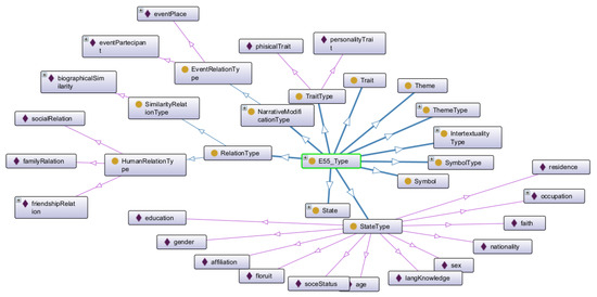 We distinguish entities—instances of CIDOC-CRM’s E1_CRM_Entity, like a real person or a fictional character—from attributes, modeled as instances of E55_Type, like a trait or a state. Traits and states define the characteristics of entities, whether real or fictional. These are modeled as subclasses of E55_Type in CIDOC-CRM, such as rtfo:Trait, rtfo:State, rtfo:Symbol, rtfo:Theme. Individuals of these classes are specified through the property P127_has_broader_term. Some classes are also defined to indicate the type of property asserted in an attribution, enabling more precise modeling of information (see Figure 3). For instance, the class rtfo:StateType includes individuals such as affiliation, age, education, occupation, residence and sex, allowing detailed descriptions of a real person’s or fictional character’s life circumstance.24 The class rtfo:TraitType includes both personality and physical traits. Additional classes have been introduced to capture more complex relationships: rtfo:NarrativeModificationType includes individuals such as narrativeOrder and contains the subclass rtfo:EventRelationType, which in turn covers aspects like eventParticipant and eventPlace. Finally, the class rtfo:RelationType is divided into subclasses such as rtfo:HumanRelationType—which covers familyRelation, friendshipRelation and socialRelation—and rtfo:SimilarityRelationType, which includes biographicalSimilarity, allowing comparisons between different lives and narrative trajectories.