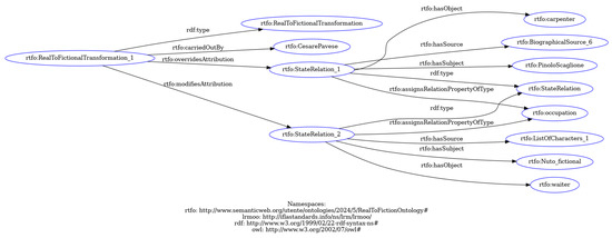 - rtfo:BiographicalRelation, which links real and fictional entities to their characteristics. Its subclasses include rtfo:HumanRelation, which assigns a type of social interaction between two entities; rtfo:StateRelation, which assigns a state to an entity; and rtfo:TraitRelation, which assigns a specific trait to an entity. For example, rtfo:StateRelation can assign Pinolo Scaglione’s occupation ‘carpenter’ to the individual rtfo:Nuto_fictional.