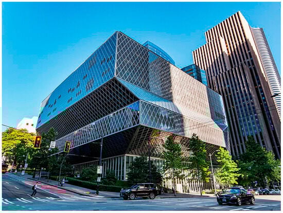 - Ɱ. 2025. «https://commons.wikimedia.org/.» https://commons.wikimedia.org/. Available online: https://upload.wikimedia.org/wikipedia/commons/thumb/2/2c/Seattle_Library_01.jpg/960px-Seattle_Library_01.jpg?20200117032014 (accessed on 22 June 2025).