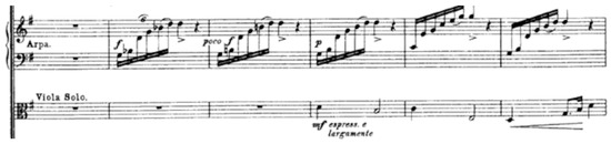 Musically, the harp strums ascending G minor and G major arpeggios in bb.36–37, dissipating the initial ombra (shadowy) atmosphere. It fades in pizzicato (plucked), leading to the solo viola’s entrance in b.38, in moderately loud dynamics, or mezzo forte (mf), indexically suggestive of tentative confidence (see Figure 5 and Figure 6).