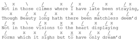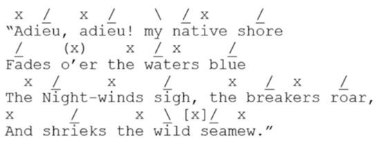 Because poetry and music share few compositional devices, comparing their sounds and rhythms is key. Ezra Pound defines “Melopoeia [as verse], wherein the words are charged, over and above their plain meaning, with some musical property, which directs the bearing or trend of that meaning” (Eliot 1968, p. 25). Lawrence Kramer extends this, asserting that “the music [of the text…] ‘reads’ a text with a deep structure that the text itself can be said to conceal or resist” (Kramer 1989, p. 167). Kramer’s concept of melopoetics, a musical-literary criticism, derives meaning from linguistic and prosodic patterns in verse. This involves phonetic transcription, rhythmic and phrasal scansion, and semantic analysis to identify patterns of recurrence, combination, and deviation. The scansions employed in this essay follow Derek Attridge’s system (see Appendix B).