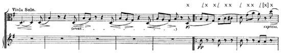 The musical semiotic approach allows analysis to move beyond harmonic and motivic structures to explore deeper intermedial relationships such as narrative metaphors and ironic tone. The significance of signs in music is often contingent on narrative sequence. Eero Tarasti’s musical semiotic theory provides a system for analysing coherence. Tarasti’s musical semiotic theory aims to identify not only the style markers but also their localisations, characterisations, and deviations. They can be labelled at distinct levels of modality (what they offer the music) and recognised at the level of musical gesture or effect, from the largest to the smallest functional components: “(1) isotopies; (2) spatial, temporal, and actorial categories and their engagement/disengagement; (3) modalities; and (4) semes/phemes” (Tarasti 2002, pp. 61, 194). From this existential approach, I mostly apply what is relevant to the intermediality: the use of thematic isotopies, the interaction among melodies, and the smallest units of meaning and sound, as applicable to the analysis; an example for the “I can” modality occurs when the solo viola plays an improvisation. Musical topics are elements of theme and form based on their formal function in earlier usages (Caplin 2005, p. 114). The combination or superimposition of musical topics is a complex isotopy, or longer semantic particle, meaning a musical narrative.