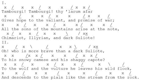 This ambivalence reappears in the Albanian folksong “Tambourgi”, a drummer’s ballad “half sang, half scream’d” (CHP, II, 72), where a maiden is asked to sing with “her many-ton’d lyre” of “the fall of her sire” (CHP, II, 72, “Tambourgi”, 7). The four-line stanzas, in iambic pentameter with hypercatalexis (an extra unstressed syllable), like “To Ianthe”, and the ABAB rhyme echo Byron’s flexible form.
