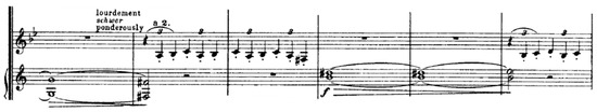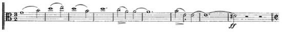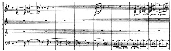 As in the prologue and introduction of the Childe, the music begins in Adagio, a slow tempo, setting an iconic background for the narrative. The lower strings play a tonally ambiguous brooding line in very soft dynamics (pp) (see Figure 1).