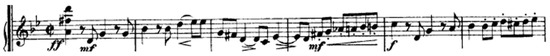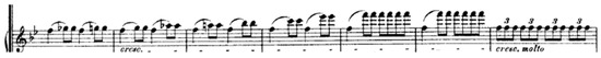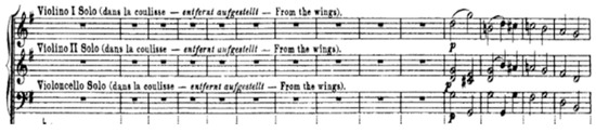 Horns and trombones emphasise the double-dotted rhythm and new chords in an echo of those introduced in other sections. The French horn (corno), a brass instrument associated with fanfare, hunting, military, and/or pastoral settings, symbolises a non-barbaric battle but also carries associations of failed transcendence. The string tremolos and timpani crescendo roll at bb.35–36, iconic of a thunderclap effect, resolving in G minor in b.36, help transition to the harp and solo viola scene in G major.