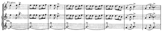 The descending chromatic motion in bb.3–4 serves as a lament or mourning gesture (Caplin 2005, p. 120), indexically conveying Harold’s melancholy. The falling minor second interval, the Pianto, or Seufzer, topic, iconically and indexically signifies an emotional sigh, first as an icon of weeping and later as “distress, sorrow, lament”, “grief, pain, regret, loss” and yearning (Monelle 2000, pp. 11, 17, 66–67). Employing the middle register of the bassoon (F#2–Bb3) in bb.3–4 iconically reveals the sonorous and expressive side of the Byronic hero. The syncopated notes in bb. 4–5 indexically signal defiance, agitation, and distress, exploiting the upper register, which is indexically associated with a “character” that is “painful, complaining, almost wretched” (Waterhouse 2001). The descending chromatic gesture in the ombra context further associates the bassoons with a cynical commentator. The juxtaposition establishes a narrative irony, aligning suffering with commentary.