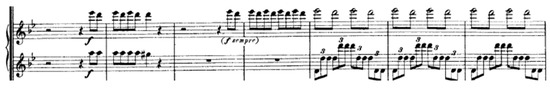 Similar to Byron’s CHP, Berlioz’s HII questions noble heroism through minor modes and sinister indexes. The second Adagio introduces the “Harold theme” in a Beethovenian heroic style, a full orchestral passage in G minor and a tension-filled atmosphere in bb.14–21 (see Figure 3).