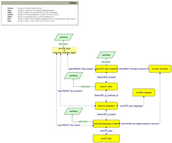 In order to illustrate the functioning of the ontology in modelling textual data according to the structure presented in Figure 1, the case of A Study in Scarlet offers a concrete example. The title, rdfs:label “A Study in Scarlet”, is assigned to an instance of lrmoo:F1_Work, which is in turn realized through an instance of lrmoo:F2_Expression. This expression, labelled “Uno studio in rosso”, was produced in 2015, with its temporal metadata captured via the property rda:P61020 “has related time span of resource”. The act of creating this expression is modelled as an instance of lrmoo:F28_Expression_Creation, whose type (crm:P2_type) is defined as a “translation” and reconciled with the Getty AAT through the URI http://vocab.getty.edu/page/aat/300027389 (accessed on 19 August 2025). The language of the expression is specified as “Italian”, using the property crm:P72_has_language. The translator, then, is modelled using the property rdau:P60385 “has translator”, and corresponds to the individual “Giancarlo Carlotti”, further identified through his VIAF authority record (owl:sameAs: http://viaf.org/viaf/71171353 (accessed on 19 August 2025)). Finally, the original author of the work is linked through rdau_P60447 “has creator” to the instance “arthur_doyle” (crm:E39_Actor), labelled “Arthur Conan Doyle” and reconciled with his VIAF identity owl:sameAs: https://viaf.org/en/viaf/65283845 (accessed on 19 August 2025).