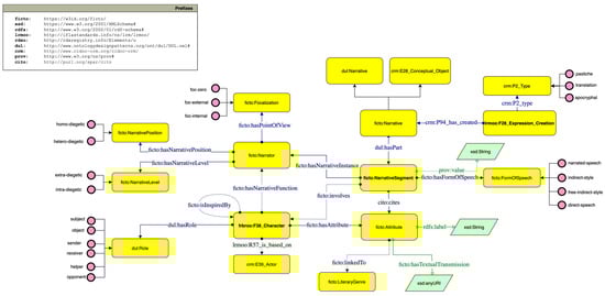 In recent years, an increasing number of scholars have explored how Applied Ontology () and Semantic Web technologies can model literary knowledge domains by structuring and operationalizing data () while preserving the semantic depth intrinsic to literary texts. Whether pursuing qualitative or quantitative purpose, and regardless of the breadth of the analytical scope (see Section 1), these technologies offer a robust formal framework for knowledge representation, allowing for the explicit definition of a domain’s representational primitives ()—i.e., the foundational elements and conceptual building blocks that define the structure of knowledge within a specific field.