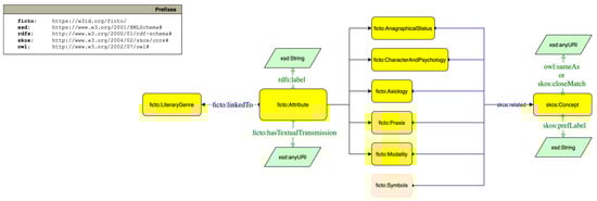 The proposed model, illustrated in Figure 3, addresses the third requirement by incorporating a detailed set of character attributes derived from the comprehensive analytical framework developed by (). These attributes are formally associated with the fictional character and are semantically linked to both their source of citation (cito:cites) and the specific character instance to which they belong (ficto:hasAttribute), drawing upon Marchese’s identification of five primary anthropological dimensions that characterize fictional entities: (1) Anagraphical Status (ficto:AnagraphicalStatus), encompassing traits such as age, gender, name, physiognomy, socio-economic condition, and professional role; (2) Character and Psychology (ficto:CharacterAndPsychology), which pertains to emotional life, affective tendencies, psychological profile, and self-perception of the character; (3) Axiology (ficto:Axiology), referring to the character’s values and worldviews, including ethical, religious, and political orientations, as well as existential beliefs and attitudes toward others; (4) Praxis (ficto:Praxis), describing actions, behaviors, habits, and communicative patterns such as manner of speaking, idiolect, and gestures; and (5) Modality (ficto:Modality), which addresses both will—such as needs, desires, intentions, and duties—and power, which includes physical means, tools, competences, and specific skills. In addition to these five dimensions, the model introduces a sixth: (6) Symbols (ficto:Symbols). This dimension accounts for the presence of recurring objects or motifs in the character’s fictional experience, along with the symbolic meanings attributed to them by the author.
