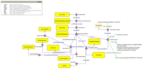 As a final step, Figure 4 expands the previous examples by showing how symbolic imagery and interrelated attributes are semantically formalized within the same modelling framework. This use case involves the formal representation of the fictional character in Le loup chantant de Forest Gate. This apocryphal narrative (classified as crm:P2_type and under ficto:apocryphal) centers around Sherlock Holmes, who serves as the main character and is assigned the role of subject (dul:hasRole, ficto:subject) within the underlying narrative structure. The story is narrated by a homodiegetic narrator (ficto:NarrativePosition, ficto:homo-diegetic), who is both part of the story and interacts with other characters on the intra-diegetic level (ficto:NarrativeLevel, ficto:intra-diegetic). This narrator adopts an internal focalization (ficto:Focalization, ficto:foc-internal), presenting the events from a subjective and limited point of view.