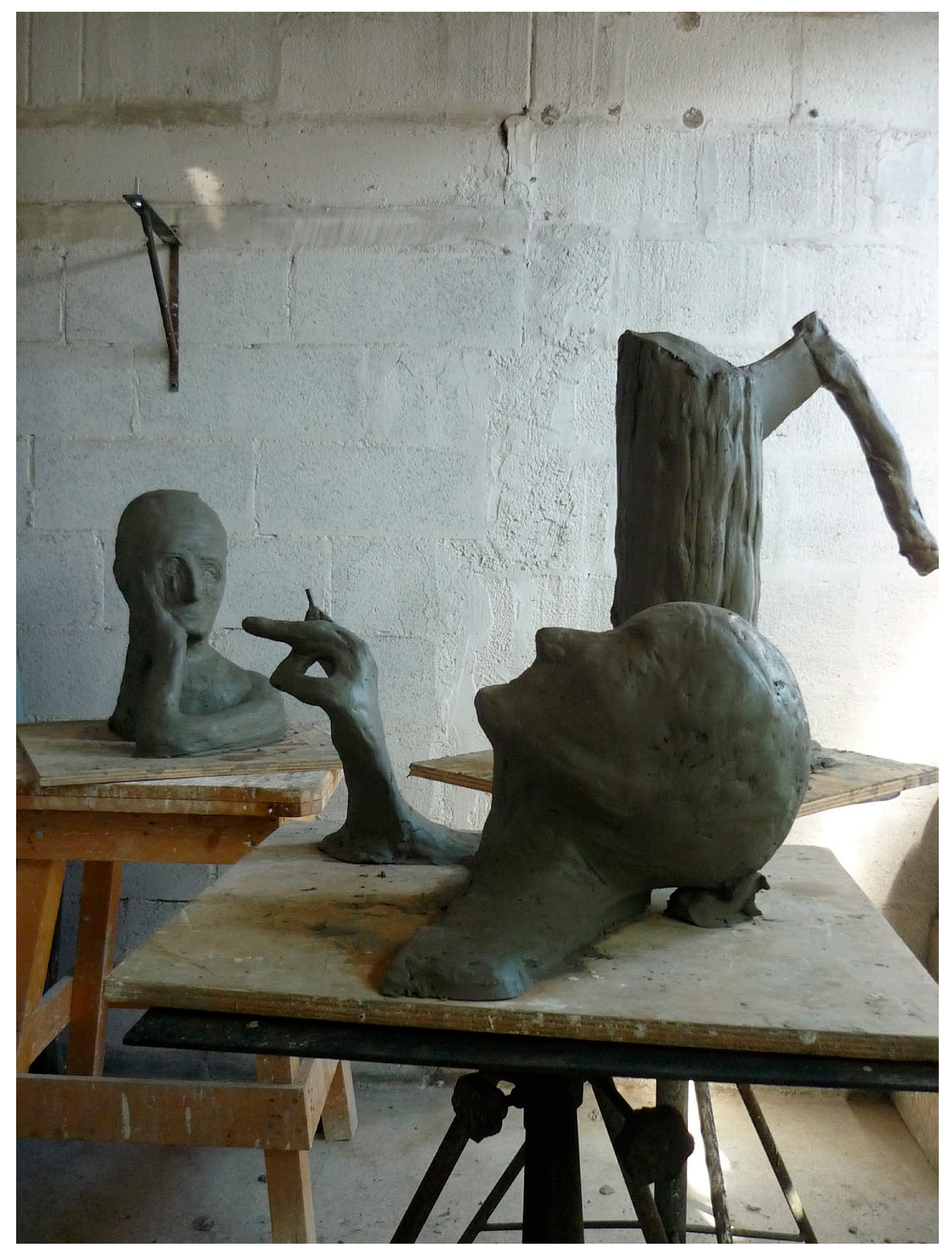 - 17 Peter Brandes: The Sculpture Hölderlin—Celan—Heidegger. Clay, 2013. In Brandes’ studio, the sculpture was made in clay, after which he cast it in bronze. In front: Hölderlin and the hand; on the left: Celan; on the right: Heidegger (as a symbol: tree stump and hewn axe). Original: Hölderlinturm Tübingen. Inauguration, 4 May 2025. The Trilogy will be permanently installed in the cloister of the Evangelisches Stift in Tübingen.