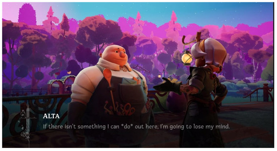 Our player character Alta really doesn’t love the idea of making tea or any of the self-directed, untimed components of the process: collecting tea plants, drying the tea, growing the flavoring ingredients, chatting with the customers. Grumpily, however, she agrees to learn to make tea and then tries to be excellent at a task that acknowledges simple completion rather than perfection. She tries too hard to help the tea shop customers, bullying them to order tea so that she can have the comfort of an accomplishable task rather than the much more amorphous and uncertain pleasure of personal connection. The player, too, might be relating with Alta’s annoyance at the game’s lack of defined goals. Alta can clearly identify her problem: she keeps losing fights. If the player thinks just a bit more abstractly, the exhaustion, burnout, and workaholism that have led her here might be the actual problem to solve. But either way, what can she (or we) do about it? What can the player do, what action can they take to ameliorate this problem? As Alta tells Boro, “If there isn’t something I can *do* out here, I’m going to lose my mind” (Figure 1). Despite the charming pink trees and Boro’s sweet calm, the “implied player” feels just as frustrated (Aarseth 2007). Throughout Wanderstop, Alta is framed as an emotional stand-in for a disgruntled player who would prefer to be playing a combat-oriented game, the same way that Alta would prefer still to be living her combat-oriented life. The implied player doesn’t want to be trapped in a cozy game any more than Alta wants to be too weak to leave Wanderstop.