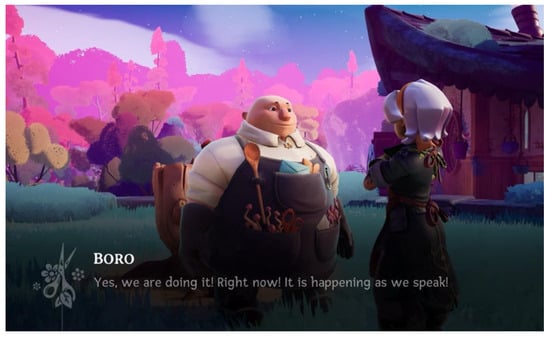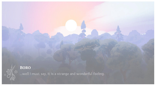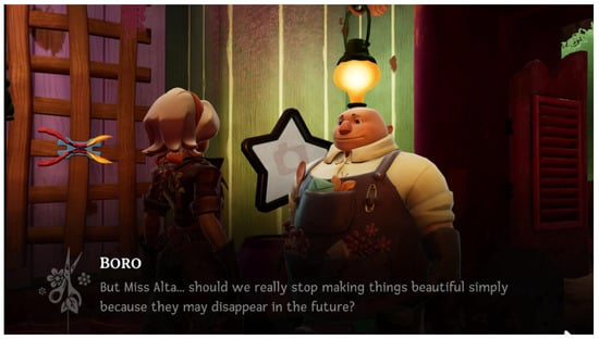 Finally, Alta cannot keep anything that she’s accomplished or acquired during a season, and this is fundamentally a defamiliarization of abundance. After each season, she opens her eyes to a clearing with a different color scheme and physical arrangement. The customers from the previous scene have disappeared (often never to return), the knickknacks and mugs she’s collected around the shop are no longer available, her painstakingly grown garden has vanished, and any multicolored pluffin or flower-planting configuration the player devised in the previous season are all wiped away. When Alta complains to Boro and wonders aloud whether there’s any purpose to beautifying the shop when the next season will just remove her decorations, he responds with a profound rhetorical question reminding the player that the point is to be present in the current season, not endlessly preparing for a future that may or may not arrive: “But Miss Alta…should we really stop making things beautiful simply because they may disappear in the future?” (Figure 6) Again, the player is jolted into the experience of presence.