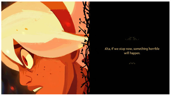In elevating stop to the level of an active game verb, the game captures the late Capitalist dilemma—even when what you’re doing is destroying you and the world around you, how do you stop? Alta must rethink her relationship to doing over and over again, in a dozen different ways, with each new season in the Wanderstop café humbling her into reframing what she considers success. Stop is a worthy challenge, difficult even to contemplate. “Alta, if we stop now, something horrible will happen,” her alter-ego threatens mid-way through the game (Figure 8). Even as Alta passes out from overexertion consistently whenever she tries to run from the teashop, her fear of stopping remains stronger than her self-preservation until late in the game.