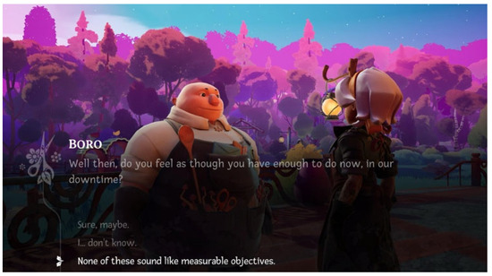 Instead of finding a new verb, a new way of doing using the active language she’s always used, she must practice not doing instead, somehow reorienting herself to the intrinsic value of not doing (and voicing the player’s parallel discomfort). One of her first difficulties is the lack of measurability in her existence at Wanderstop. She keeps asking Boro what she should be doing and his answer is often along the lines of “Yes, we are doing it! Right now! It is happening as we speak!”(Figure 9) Alta isn’t satisfied: “What’s the value of living that way? How do you know it’s enough? There’s no indicator.” In another conversation, Boro explains “downtime” to Alta and asks her “do you feel as though you have enough to do now, in our downtime?” To which the player can pick between three responses: “Sure, maybe.” “I…don’t know.” And, my favorite, “None of these sound like measurable objectives” (Figure 10). Wanderstop holds space for Alta’s cranky discontentment, both in the snarky responses she can make to Boro’s monk-like non-answers and in the many smaller goals the game enables and encourages to help her find something measurable she can accomplish (my favorite I discovered: the first time Alta pours precisely the right amount of tea into a mug, the game rewards her with an acknowledgement). The anxious player can also use traditional user interface tools to orient themselves in their immediate goals (tapping R2 on a PS controller to highlight the location of Alta’s customers, who each have a symbol above their head if they have a live request, or looking up recipes in the field guide). But the game also steadily reminds the player that these tasks are not Alta’s real goal, nor is it finding Master Winters, as Alta would identify it during the first half of the game. Once when she says that goal aloud, Boro responds, “No, not that one. The bigger goal.” The bigger goal is to learn how to stop.