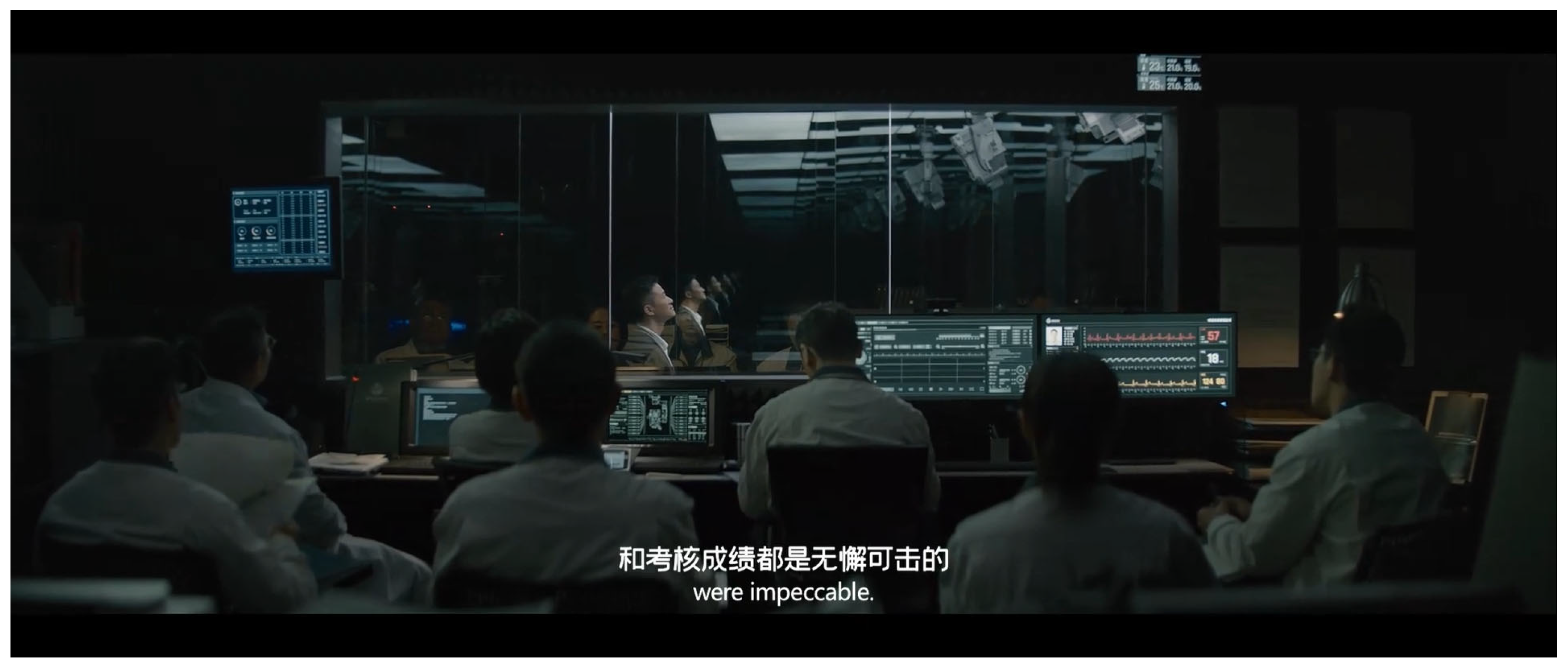 Tu first appears in the testing-room sequence as a 550-series engineer seated behind the one-way glass among the evaluators. When Liu turns toward the glass and says, “I just want my family to survive,” the film cuts to Tu’s concerned face and overlays Liu’s image with Tu’s reflected gaze. The superimposition briefly collapses the intended separation between evaluated subject and institutional evaluator into a relay of recognition. A car-crash flashback, in which Tu loses his wife and daughter Yaya, clarifies why Liu’s procedural confession registers to him as a demand that exceeds calculation. Tu is structurally doubled. He participates in the metrics that sort lives yet remains haunted by what they cannot contain.