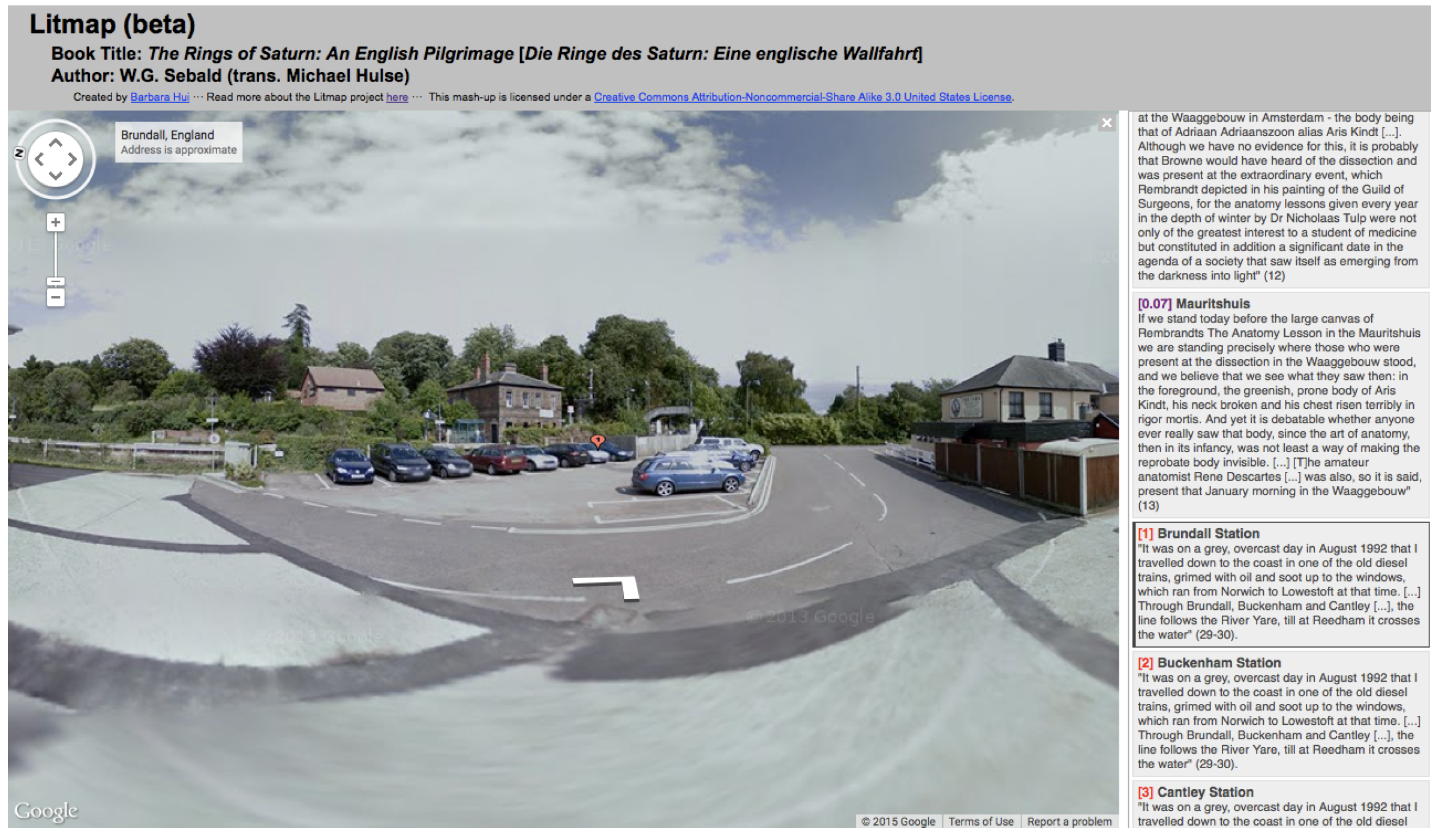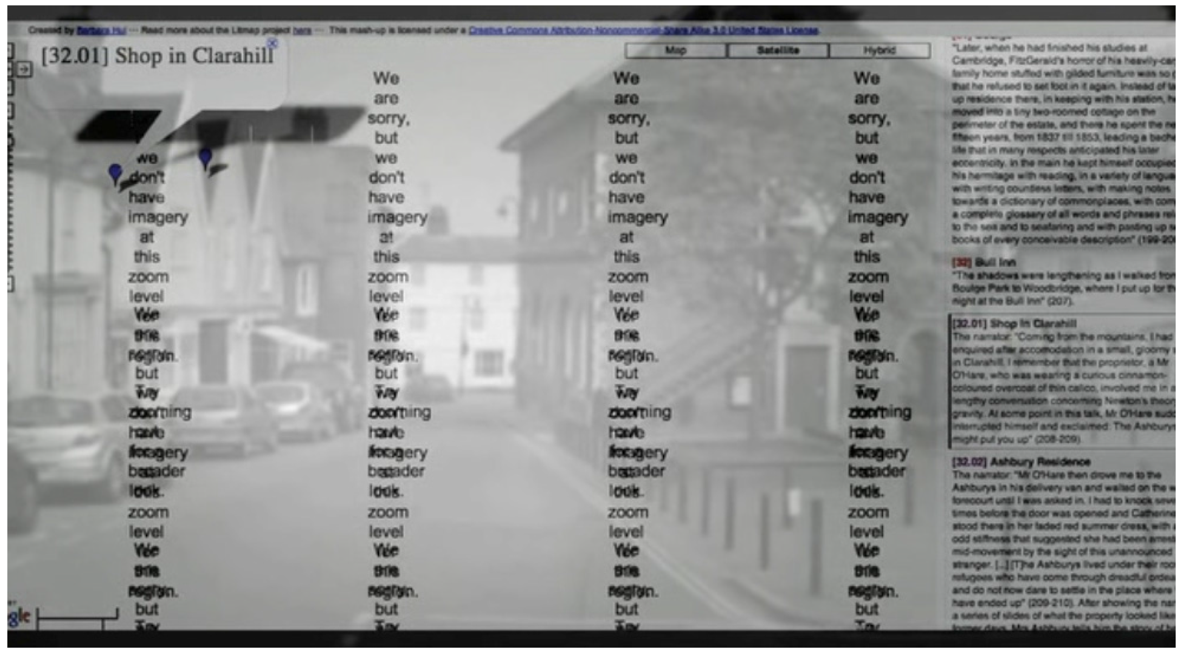 Hui acknowledges, however, that there are certain challenges and limitations with her project, and with narrative cartography in general. For instance, she points out that “Sebald has a ‘cosmological’ notion of historical space in addition to the local and global one. It is not possible to map this cosmological notion of space using the Google Maps API!” [26]. Sebald’s writing is a hybrid of travelogue, autobiography, history, and fiction, among other genres, and as Piatti et al. have pointed out, there are particular challenges in mapping fictions, even those based in real world counterparts [25]. Locations may be vague, partly or completely invented. In addition, Hui points out that the use of Google Maps or similar “restricts the user to that vision/version of geographical space. When you’re working with that data, be aware that you’re working with those pre-provided layers of information, which have their own inherent assumptions built in” [26].