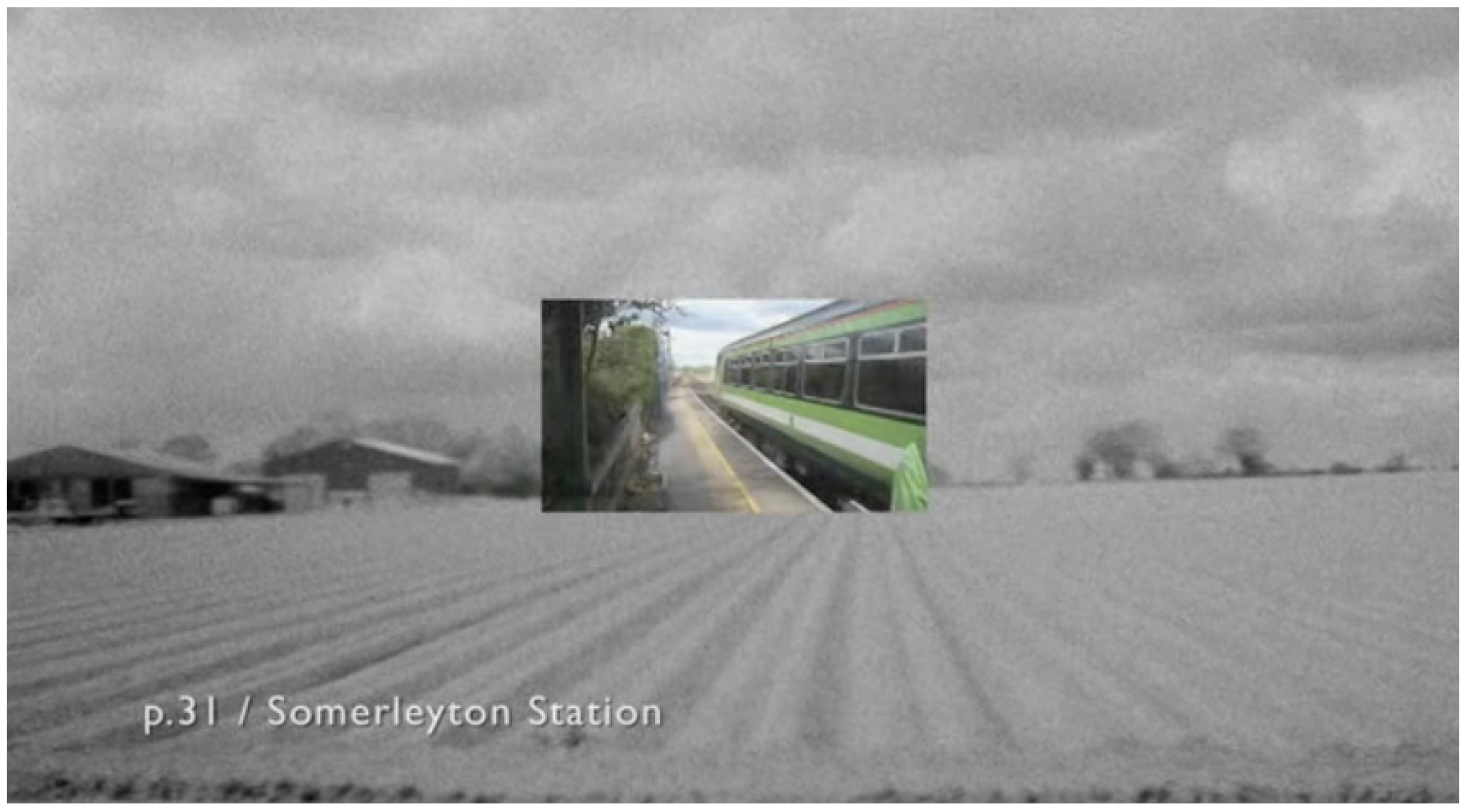 From the Google Maps mashup in the opening shots of Patience, we move to a long horizontal tracking shot of an East Anglia train, which we would infer (if we are following along with book in hand) is leaving from Norwich, bound for Somerleyton Hall, Sebald’s first stop (see Figure 3). The film cuts from the satellite map of the world to the street level point of view on the train station, encapsulating the movement to the second of the three “cartographic shapes” of the film: the panorama. A beautiful black and white extended tracking shot travels the length of a train, the words “East Anglia” on the sides of the coaches, giving way to travelling shots from the train, of the tracks and the countryside.