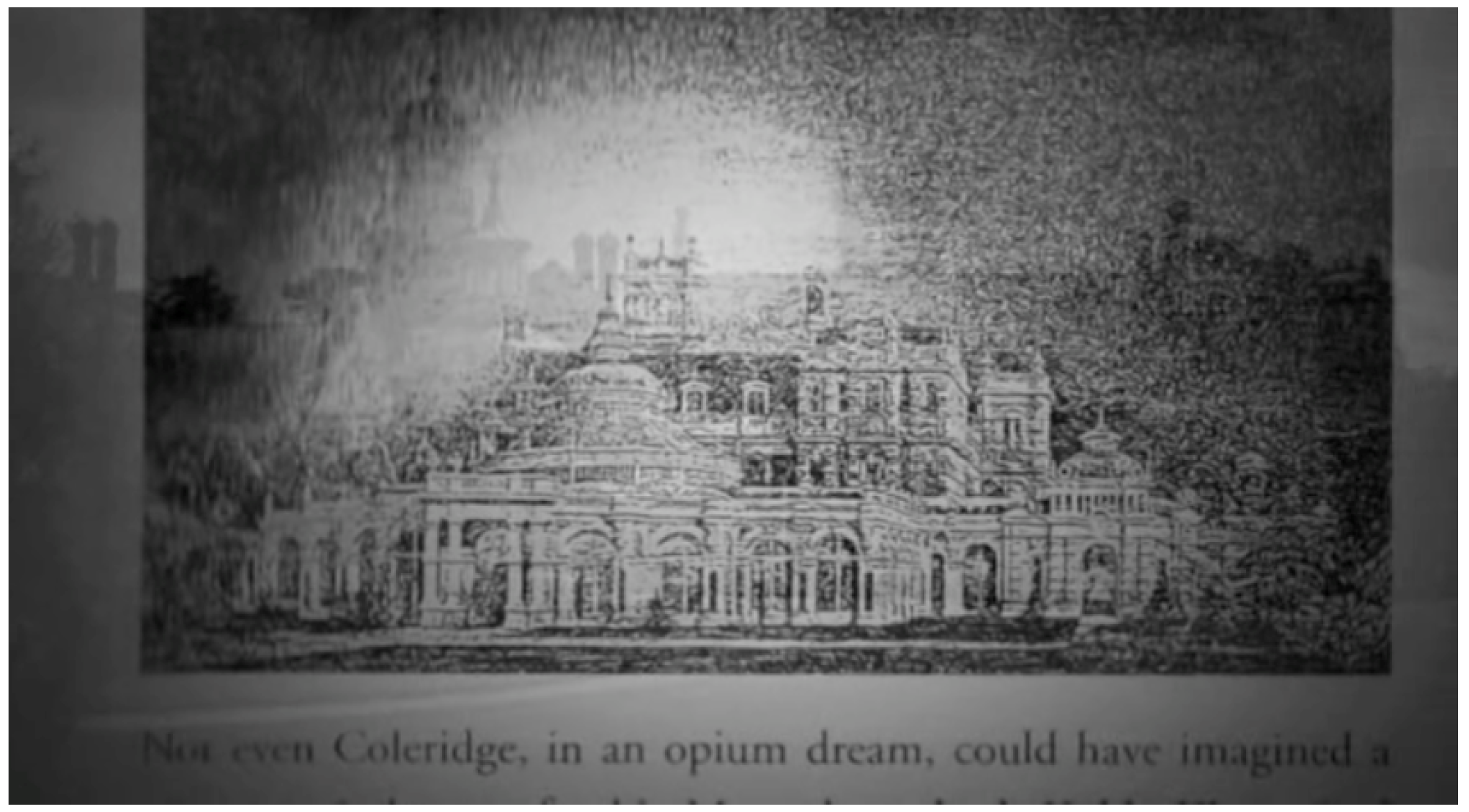 Screenshot from the film Patience (After Sebald) by director Grant Gee (2011), showing an image of Somerleyton Hall from Sebald’s book The Rings of Saturn superimposed on a cinematographic image of the same view.