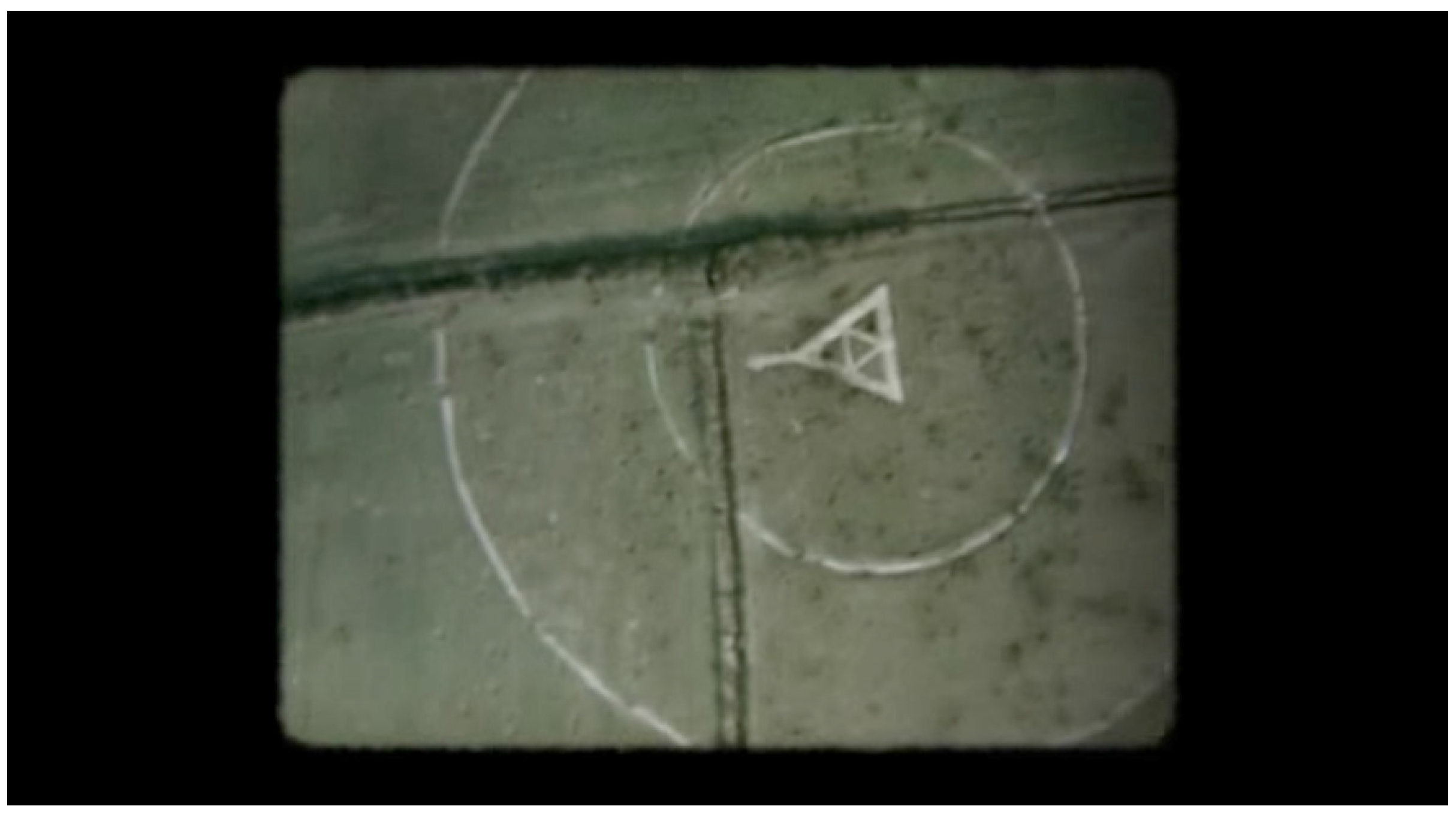 Alone, visual strategies, whether maps or panoramas, are not enough to give a full sense of place. They are tools for the mapping impulse to describe space, and to open the way for the tour, for narrative, (auto)biography and history, which deepen the picture. This next scene in the film constructs a narrative spiral, following that of the book’s, to recount Sebald’s chance meeting with a gardener at Somerleyton Hall. The gardener finds out Sebald is German, and tells him about the planes setting out from the 67 airfields in East Anglia to bomb Germany. Over this, we see what looks like archival footage of warplanes and bombs, projected on a screen. This is the aerial view in the original usage of the term which, as Castro points out, was associated with war and military operations. In the film, we see aerial footage from the East Anglian Film Archive, shot from planes dropping bombs onto a large target painted in white lines on a green field (see Figure 7).