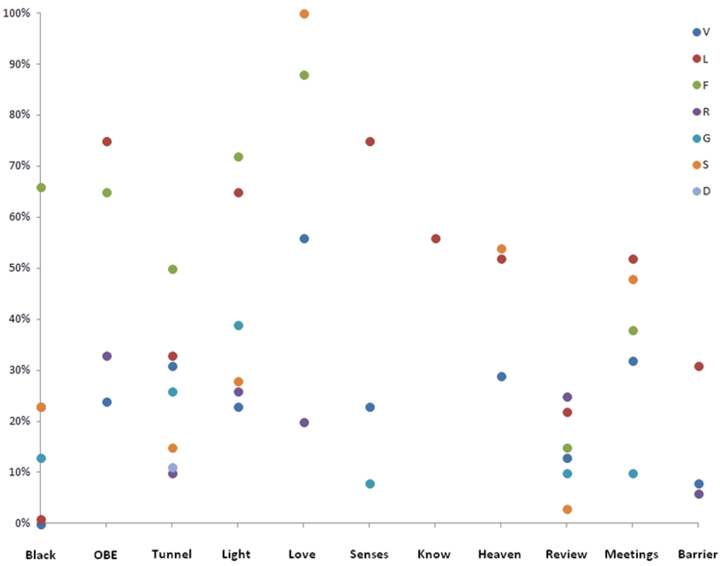 This scattergram plots the percentage (vertical axis) of subjects experiencing the varied features of near-death and out-of-body experiences (ND/OBE) (~800 as recorded in the works of prominent authors in this field): as far as is possible, these data have been extracted and forged into the major experiential groupings (along the horizontal axis). Contrary to expectation, there is no obvious correlation, symmetry or uniformity among any of these categories. Extraordinarily, they point to the marked randomness of the experiences reported for this large cohort of subjects. This is the first occasion on which these results have been drawn together in one composite diagram. What is quite evident is that these cumulative data fail to underpin the smoothed accounts of ND/OBE phenomenology which many of these authors are keen to enunciate and present to the public and media.