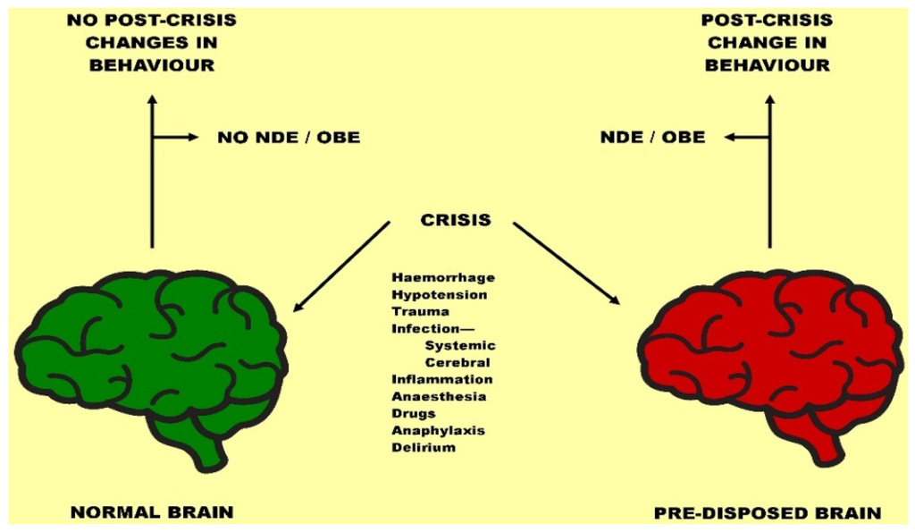 This way of thinking inevitably suggests possibilities of brains that are predisposed in those subject to ND/OBE. An analogous occurrence is post-traumatic stress disorder (PTSD), for whom following the endurance of a severe, life-threatening crisis, there is a marked later change in phenotypic behaviour as well as manifest epigenetic changes to the genome []. For many PTSD candidates, there is a clear history of childhood abuse—verbal, physical, even sexual. And with other forms of fearful, threatening assault, including facing a gun or knife, or undergoing rape, the residual horrifying trauma of such encounters can be persistent and hence life-destroying. These early influences have profound, long-lasting influences on subjects’ subsequent mental profiles—however that profile may be realised in later years [,,]. And if severely stressful occasions interfere with later life behaviours, might not lesser impacts likewise lead to other forms of deviant or unexpected behavioural responsiveness?