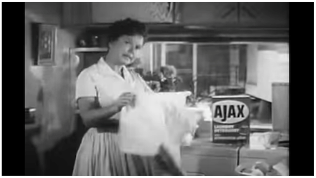 In print media and on television there was a focus for increased visuals and less copy, fewer words. There was a desire to find new ideas, new characters, and new ways of selling products. Both the programing and advertising on television followed suit. Let’s take a look at this TV spot for Ajax laundry detergent soap featuring a fabled White Knight of European lore that straddles the line between the showing of the 60s and the telling of the 50s: (See Figure 4)