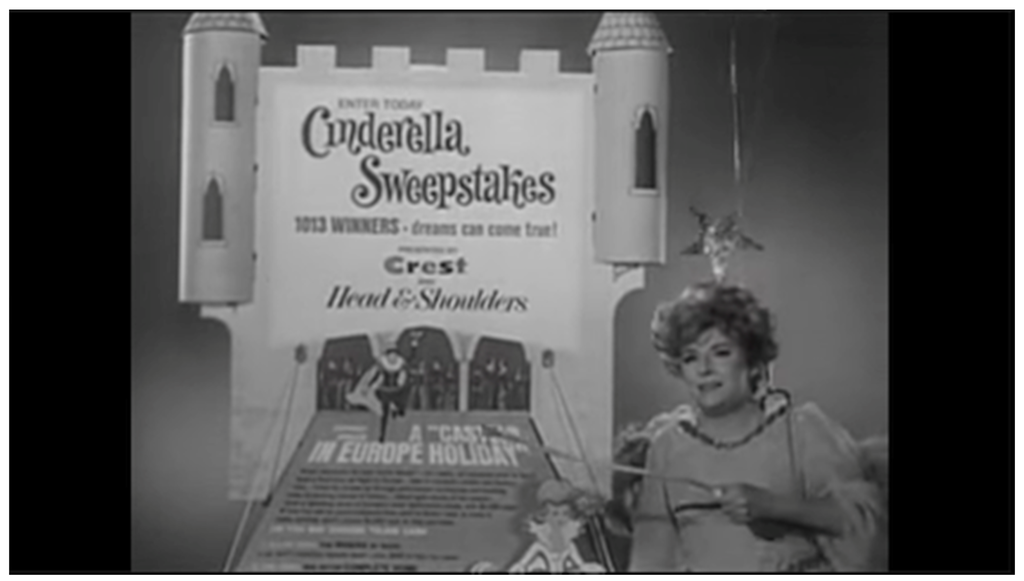 Next, let’s take a look at an advertisement that attempts to blend humor with a fairy tale figure. This time it’s the Fairy Godmother, breaking the fourth wall to publicize a prize giveaway from Crest in connection with the 1965 television broadcast of Rodgers and Hammerstein’s Cinderella (See Figure 5).