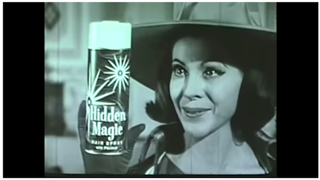 It would be misleading to say that all or even most commercials of the 60s strove for artistry over clarity or suggestion over description. Take for example this ad for Hidden Magic hair spray starring Wanda the Wonderful Witch (See Figure 6).