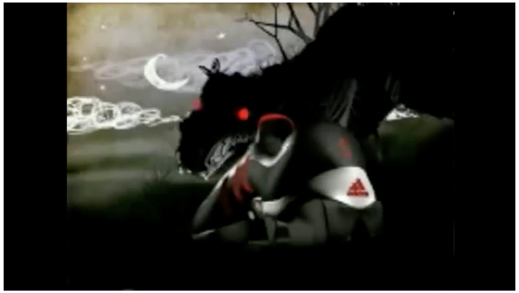 In the ad, Peter returns to a grown-up Michael and invites him come fly again. Smash cut to Peter riding shotgun while Michael drives a new Mercedes across the English countryside by moonlight. “It’s never too late to fly”, says Peter in the ad. In other words, it’s never too late to transform your life back to the happiness of youth through spending money. Other clichés from previous decades like sexualizing fairy tale figures continued, as seen in this Pepsi One commercial featuring Kim Cattrall as Goldilocks with the Chicago Bears. On the flip side, commercials like this 7 Up Red Riding Hood spot pushed back on those genre expectations by having Red head-butt the wolf stand-in at the end of the commercial. And other commercials, like this one from Adidas, went for an artistically bold modernization with a stripped-down narrative (See Figure 17).