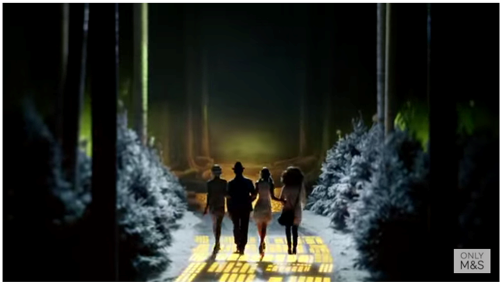The ad depicts a wedding attended by unicorns, teddy bears, ballerinas, soldiers, hummingbirds, and magically blooming flowers. The father, who walks his beautiful princess down the aisle, watches as his daughter marries prince charming. In the end it turns out the commercial takes place in the mind of a father watching his young daughter while she reads a book of fairy tales. Commercials like these are complicated by Marina Warner in “Once Upon a Time”, where she comments on the fairy tale’s spotty history with gender representation. “Current fairy tales on stage and screen reveal an acute malaise about sexual, rather than social, programming of the female, and the genre continues ever more intensively to wrestle with the notorious question Freud put long ago, ‘What do women want?’“ ([], p. 173). The PNC Bank spot is perhaps a bit too Freudian as the father imagines what his grown daughter wants most as a fairy tale wedding, prompting him to open a new savings account to prepare for that eventuality. With this question of gender representation in mind, this Christmas commercial from Marks & Spencer (M&S) becomes almost painful to watch (See Figure 20).