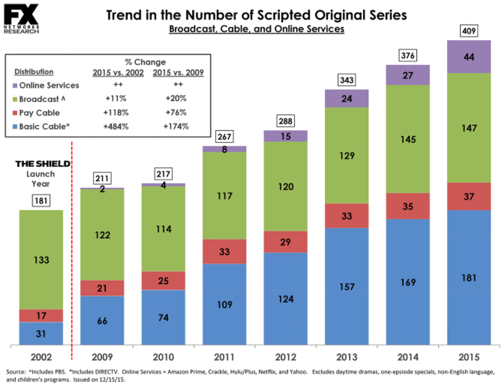 In his 1979 book, “Breaking the Magic Spell”, Jack Zipes shared the story of Priscilla Denby, a researcher who spent an entire day watching TV in 1969 logging all the traditional folklore and fairy tale items featured in shows and commercials. In 1969 Denby logged 101 themes in one day of television ([], p. 119). In 2016 we live in a time described (sometime jokingly, other times seriously) as Peak TV. As more channels and online content providers attempt to stake out ground and cement their place in the media landscape, more and more television shows are being produced. According to research done in 2015 from the television network FX, there has been an unprecedented rise in programming from all television networks and content producers in the last few years []. In 2009 there 211 original scripted series, 217 in 2010, 267 in 2011, 288 in 2012, 343 in 2013, 376 in 2014, and 409 in 2015 (See Figure 21).