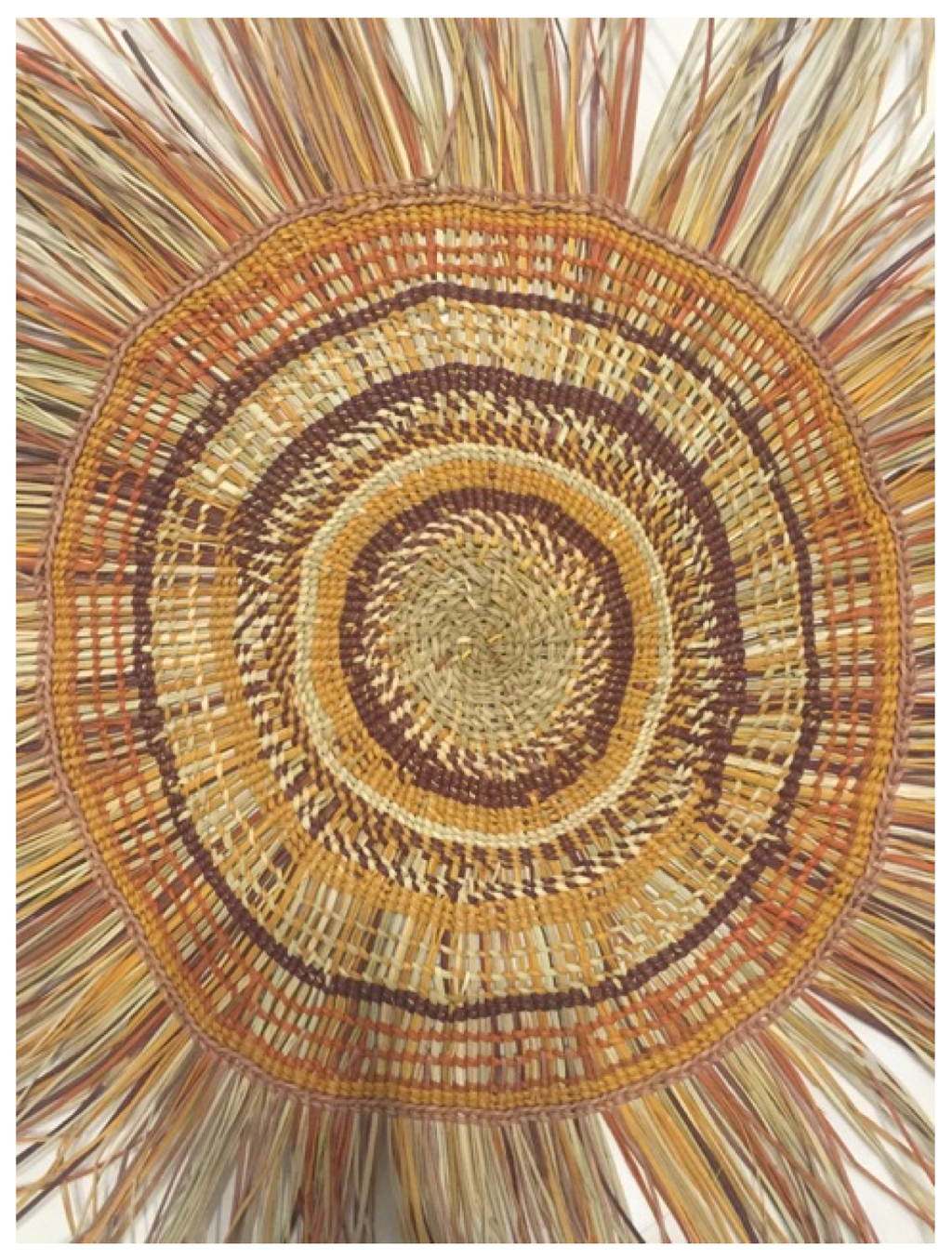 Yolŋu mathematics is very complex. It talks about place and it talks about the ordering of numbers, the infinite cycles and patterns that hold the world together. The ordering of numbers is like this mat (see Figure 1). It is woven, and in the middle is its starting point. Every child who is born is in the system. They have a place. They have a family [25]. They have totems. They have a language. Kate, Sarah and Sandie’s adoption as Bawaka family embodies this situatedness—is an ongoing aspect of Yolŋu mathematics’ co-emergence, co-becoming through infinite patterns of recursion that loop and fold, making and remaking people and Country, time and place/space [8]. As Merrkiyawuy states: