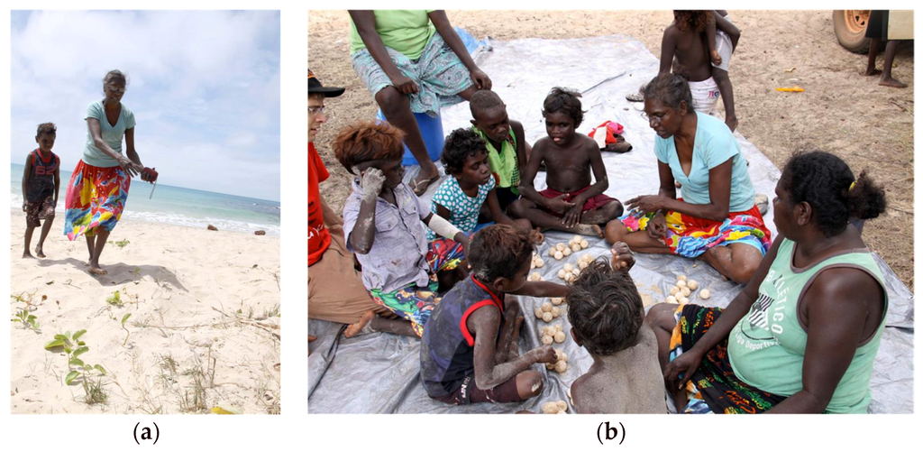 Figure 3. (a) Merrkiyawuy identifying miyaupu tracks; (b) counting miyaupu mapu with Yirrkala School children.