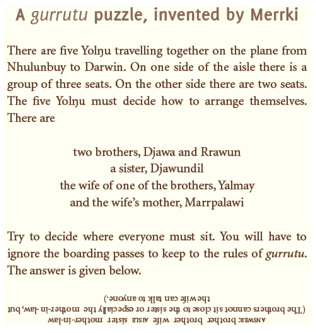 This is done in ways that emphasise the place-based and situated nature of Yolngu mathematics, but also in ways that may challenge tourists’ conceptualisations of Indigenous knowledge as something located in the past, without reference to contemporary realities. The puzzle designed by Merrkiyawuy (see Figure 4) makes the vibrant, contemporary and practical ramifications of gurrutu abundantly clear.