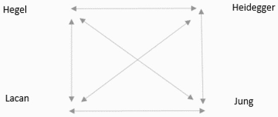My work continues in the tradition of reading one philosopher with another to show a different perspective on the same phenomena. Zizek has read Hegel with Lacan, I have read Heidegger with Jung and now this current article applies my Heideggerian interpretation of Jung to a Zizekian interpretation of Lacan. Just as Zizek says “To my eyes, Lacan was fundamentally Hegelian, but did not know It” ([8], p. 3), my work shows that Jung and Heidegger were fundamentally Lacanian ‘but did not know it’. Zizek explains Lacan’s “Hegelianism is not to be found where we might expect it to be, in his overt references to Hegel, but rather in the final stage of his teachings, in the logic of the pas—tout, in the importance he placed on the Real, on the Lack in the Other” ([8], p. 3). Likewise, although Jung and Heidegger do not make overt references to Lacan, their writing is compatible.