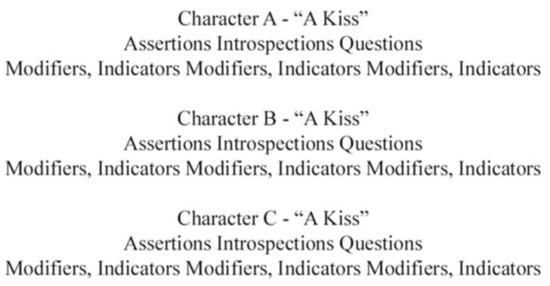Although Aristotle’s six elements of drama (Spectacle, Character, Fable, Diction, Melody and Thought) remain essential to the construction of contemporary cinema, the narrative modes of I’ll Be Fine follow no Aristotelian logic of connection, hierarchy, or cause and effect, but are sequenced according to computation []. There are five modes, or event zones, in I’ll Be Fine. These were organized according to the plan shown in Figure 4. Since this is the story of a breakup, the five events, chosen for their archetypical qualities, are: he/she kissed me, now I remember/now that makes sense, I saw him/her, a fight broke out, am I supposed to wait? Within those five modes there are three types of story element: Assertions, Introspections, and Questions. An assertion is a character’s plain statement of fact or belief: “She was late” or “I never believed Tom”. Introspections are a guess at another character’s state of mind or motivation: “She wanted me to worry” or “She was trying to impress Fred”. Questions are about anything in any mode: “Maybe she planned to be late?” or “I wonder how he felt about Harry?” Within each event mode there are, in addition to the three types of story elements, two classes of statement: modifiers and indicators. Modifiers are graphics or texts that amplify, reduce, suppress, or in some way transform a story element by occupying its foreground plane. Indicators are informational elements that establish identity, time, location and any other details a character might use to fix an emotion in their reality.