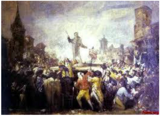 As José Miguel López García has affirmed in his work on the Esquilache Riots, the revolt was eminently “un movimiento popular” (a popular movement) whose main social actors were servants, artisans, construction workers and day laborers; in general, “trabajadores que vivían de su salario en unas condiciones miserables” (López García 2006, p. 14) (workers who lived off their salaries in miserable conditions). This active participation found artistic expression in the visual production of the time. A number of paintings featuring the Esquilache Riots put at the center of the frame the unity of the populace, leading actor of the disturbances. Such is the case of Goya’s famous painting “The Esquilache Riots” (1766) (Figure 1), which illustrates one of the manifestations of crisis in the urban as a space of social diversification and therefore more prone to rebellions and protests.4 Scholar of modern Spanish cultural studies Nil Santiáñez explains this concept of urban crisis well: a destabilization of order provoked by the masses due to a moment of high social tension in which the normativity of the urban space is questioned and subverted as the citizen deviates from civic codes of urbanity and traverses physical boundaries and symbolic norms, opening up the potential for the disruption of these norms (Santiáñez 2003, p. 213). Indeed, Goya’s painting shows a multitude of rebels in a defiant attitude gathered in downtown Madrid, as indicated by the town hall tower on the left of the frame and the royal palace in the background. The urban blurring of limits is reinforced by the social dissolution of borders, a symptom of modernity according to Berman: in this central street members of the pueblo dressed against Esquilache’s reform, representatives of the upper classes in dress coats, and a Franciscan friar coincide—nobility, clergy and the working class, representatives of the three strata that shaped the social mosaic of mid-18th century Madrid.