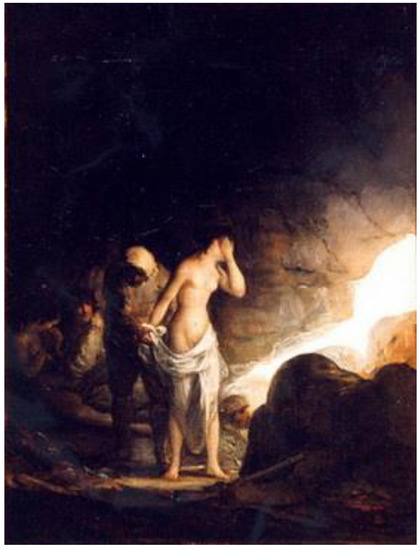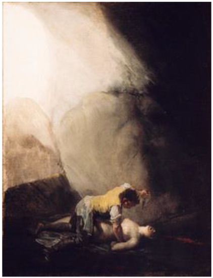 The cultural representations of the time contributed to bringing to light this active female participation. In the 82 prints contained in the series The Disasters of War, painted between 1810 and 1820, Goya moves away from painting tapestries commissioned by members of the aristocracy and etchings of vain feminine models embodying vices and capricious habits to focus on women from a new perspective, as victims of violence but also as leading agents of the battle. The engravings give prominence to working women in different roles. There are several plates showing women in an attitude of passivity and resignation, as indicated by the passive verbs used to describe them: woman awaits, rests, lies at the ground, lies dead, huddles behind ruins, kneels. These images have two important antecedents in two dramatic scenes painted between 1798 and 1808 by Goya: “Bandido desnudando a una mujer” (A Bandit Undressing a Woman) (Figure 2) and “Bandido asesinando a una mujer” (A Bandit Knifing a Woman) (Figure 3) in which women occupy the central space of the frame, not only as objects of representation but as objects of sexual and physical violence in that their naked bodies are being brutally used for male recreation.13