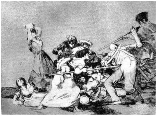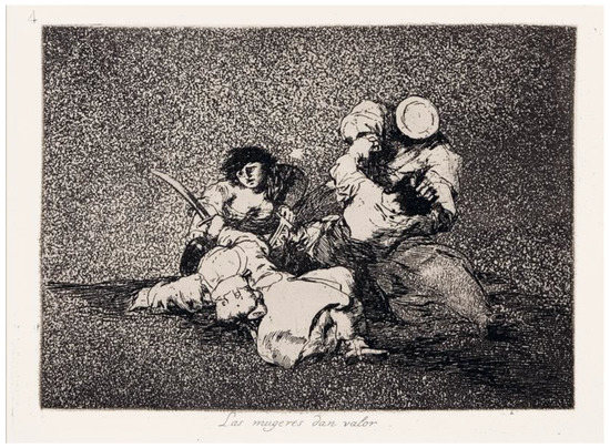 However, the fact that these warrior women appropriated a male role and emerged as virile or manly women identifies them with those New Women that appeared in the European literature of the late 19th century who questioned the womanly ideal and wanted to be at the same level as men (Charnon-Deutsch 1994, p. 143). To attain this, the first step is appropriating traditionally male physical spaces, such as the battlefield, as well as symbolic ones, such as the right to carry and use weapons and defend the homeland and, by extension, access to citizenship or citoyenneté (Bock 2002, p. 42). In this sense, Lynne Hanley, among others, has identified war as a key space for the negotiation and articulation of gender identities (Hanley 1991, pp. 134–35). Here, the female presence proves to be disruptive as it would come to alter the normativity of the urban space and to usher in a world of inverted roles. Goya takes women out of the reclusion typical of the Ancien Régime and gives them a new position of much greater visibility in which “they were not only much more widely seen, but also much bolder in their general behaviour” (Esdaile 2014, p. 8). Women as wild beasts destabilize the order and introduce a new order of crisis when they abandon the submissive role and walk away from the traditional image of the compassionate, resigned and selfless woman circulated by conservative gender discourses.