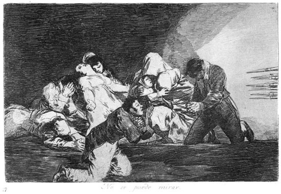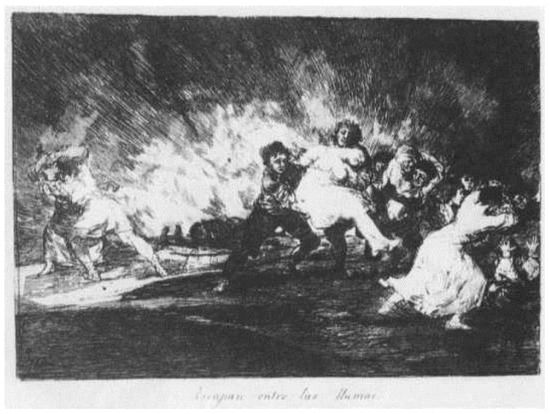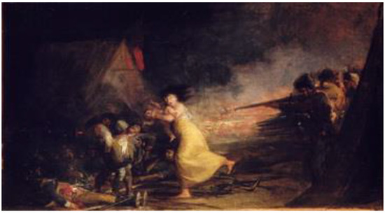 In this appropriation of a male role lies the rejection of the marginal role of women and the demand for equality on which the agenda of the first wave of feminism will be built in the second half of the century. The engravings “No se puede mirar” (One cannot look) (Figure 6), which brings echoes of the famous Third of May 1808 painted by Goya in 1814, reveals men and women alike being the target of execution by a French firing squad; and “Escapan entre las llamas” (They escape among the flames) (Figure 7) shows men and women together running into the night, amidst chaos and terror. These images are both inspired by another 1808–1809 painting from the Marqués de la Romana collection, “Ataque a un campamento militar” (Attack on a Military Camp) (Figure 8) that shows a woman in the center of the piece cradling a baby and standing next to a group of male civilians, all of which are about to be shot by French troops. By turning women and men into equal victims of the horror of the war, Goya’s political eye reduces the distance between the sexes, moves forward in the social itinerary of women, and introduces a principle of equality that, overcoming biological differences, needs to be read as a demand for the exercise of individual rights. In this sense, Goya turns a dreary episode into a political and cultural revolution which is a tribute to equality and, by extension, to modernity.