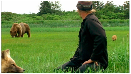 As Herzog suggests, Treadwell held a fatal misconception. He did not realize that, instead of waiting for a big, furry, moving automaton to accept his tedious attempts at courtship, he could have pursued a probably less thrilling yet more dependable relationship: “Beyond his posings,” Herzog states, “the camera was his omnipresent companion.” (Grizzly Man 2005, 00:39:05). This notion of companionship with the camera also has consequences for the question of genre. According to Herzog, Treadwell’s footage constitutes “something way beyond a wildlife film” (Grizzly Man 2005, 00:37:36). In Herzog’s terms, however, this “beyond” implies nothing but the irrelevance of “wildlife” altogether:3