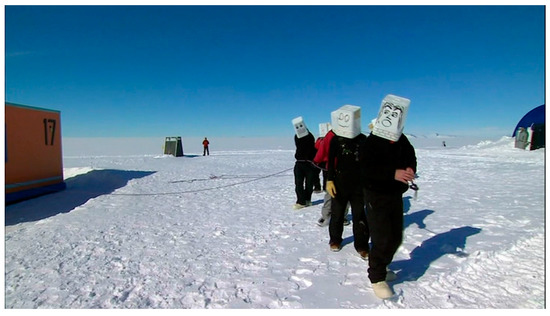 Therefore Encounters does more than show the sometimes peculiar proceedings of a remote research center within a seemingly barren and lifeless icescape. The film displays a particular curiosity for different ways of interaction and confrontation between humans and nature, including various animals that range from penguins, seals, starfish, and underwater crustaceans all the way to single-cell organisms. Furthermore, the film engages with complex natural systems and their inherent, stretched temporal scale such as drifting icebergs, volcanism, climate, and the impact that human civilization has on them. This way, a holistic view evolves of humans as entangled within a complex multitude of various life forms and material forces whose dynamic seems intractable. This depiction of nature as animate and elusive is emphasized by a distinctly self-reflexive form of representation that puts the camera, as it is used both in scientific and artistic contexts, into physical proximity with a more-than-human world.5 The effect of this aesthetic is not only a defamiliarized image of the environment, but also of human observers and their spatial position in regard to nature. All inhabitants of McMurdo are required to participate in a two-day survival school, part of which is the “bucket-head whiteout scenario” that tries to imitate the meteorological conditions of a whiteout. In situations of severe snowfall or fog, conditions of visibility can be blurred to such an extent that any spatial orientation in regard to the corporeal outline of objects and the horizon becomes impossible; an experience that is understandably described as disconcerting and frightening. With some amusement, Encounters shows a hopelessly disoriented training group that gradually loses any orientation and is neither able to reach its supposed destination nor its point of departure (see Figure 3).