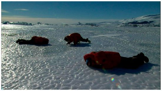 This rather uncomfortable tableau vivant manifests a literal freeze-frame of the human body (see Figure 4). The temporal continuity of the film is interrupted, the three figures are arrested in their movement and thus seem to embody the very act of attentive listening to the calls of the seals. The ice above the Ross Sea turns into the vast membrane of a loudspeaker, from which the sounds of a foreign and utterly strange world right underneath one’s feet resound. Just like bears, seals are predators. However, they are depicted sinking elegantly into the deep like gentle and peaceful torpedoes. Eiser compares their calls to the music of Pink Floyd or even to a sound that originates rather from outer space than from organic nature.