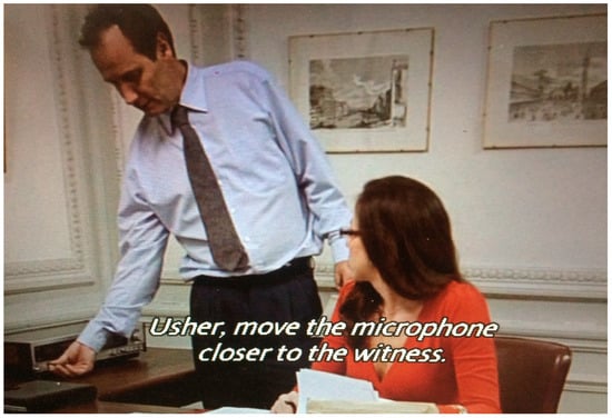 It is no exaggeration to say that the film remains stuck on this moment in the Barbie trial; for in the next scene, no longer set in the mother’s home but instead in her son’s office, the same testimony, that of Lea Katz, an eyewitness to the notorious roundup of Jews at the UGIF on 9 February 1943, is broadcast once again. This time, however, her testimony is heard on the radio instead of being seen on television (see Figure 2).
