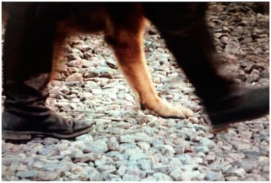 Like the dance of the mother and son at the beginning of the film, this one involving Victor’s grandmother and grandfather begins slowly, gently, and lovingly (see Figure 4). The two look deeply into each other’s eyes as though for the last time while familiar music plays quietly in the background. Yet, as the music speeds up, the dance partners turn ever more rapidly around each other and the action itself becomes harder and harder for the audience to follow. The film cuts with increasing rapidity between inside and out, between hidden Jews, caged animals, and those who have come to hunt them down. As chaos, terror, and panic spread, a sense of visual disorientation is compounded by ever-increasing levels of acoustic interference. The familiarity of the French language quickly gives way to a confusion of tongues, to linguistic babble that in its turn disintegrates into pure, almost deafening noise. At the center of this wrenchingly violent scene and at the height of its overwhelming chaos, all the audience sees is gravel crushed under foot. All it hears is the grinding of stones, the firing of guns, the growling of dogs, and the incoherent barking of commands (see Figure 5). What began slowly as a couple’s turning embrace quickly accelerates into a vertiginous dance of death.