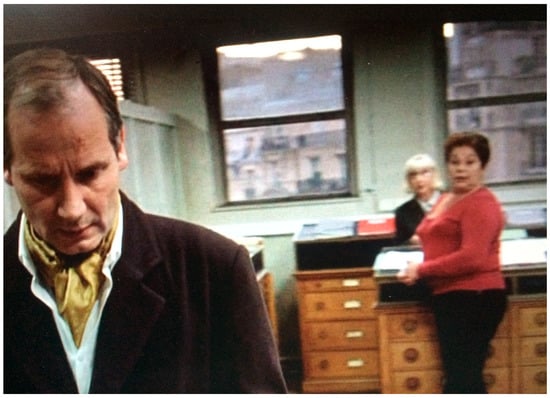Gitai takes this movement of circulation and exchange one step further. Moving beyond the auctions in which mother and son each in turn take part, he adds a final scene set at the CIVS established in 1999 by the French government in recognition of its responsibility in the deportation and murder of French Jews. During his appointment at the commission, Victor sees a price being placed on everything his maternal grandparents had once owned. Yet, rather than feeling that justice is now finally being served, that the story of his mother’s side of the family, kept secret for close to sixty years, is now being publicly aired and officially addressed, Victor seems only to feel increasingly uncomfortable, anxious and overwhelmed (see Figure 8).